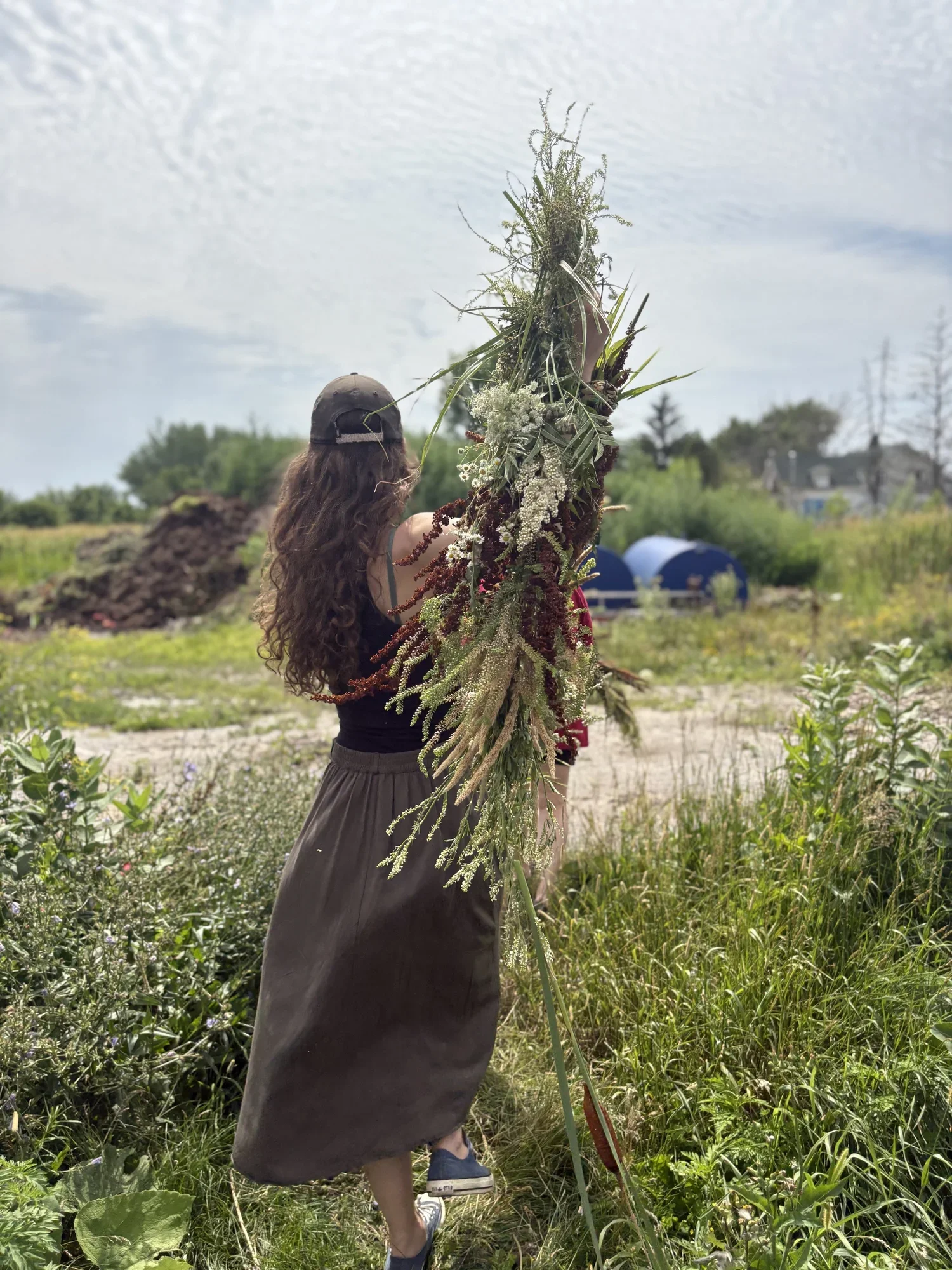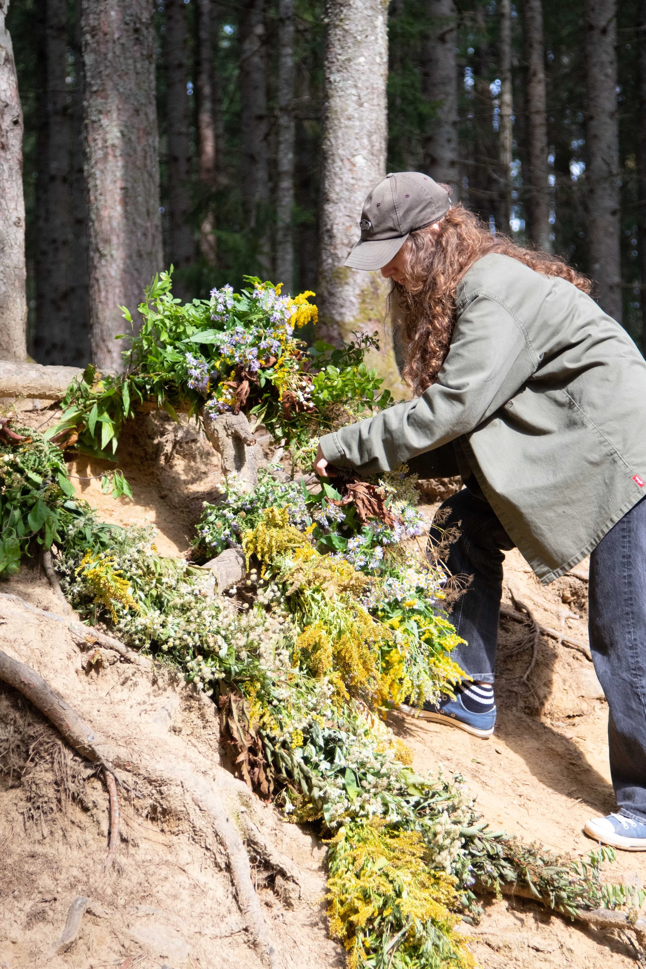 Diplômée de l’École d’agriculture de Nicolet et en arts visuels à l’UQAM et à Concordia, elle s’inspire de la nature, des textures brutes et des matériaux qu’elle récolte. Ses œuvres, souvent in situ, traduisent un rapport instinctif au vivant. Elle collabore aussi à l’univers du cinéma, où son regard végétal façonne des décors habités. Entre nature et artifice, fragilité et robustesse, sa pratique trace des zones sensibles, ancrées dans l’émotion et la matière.